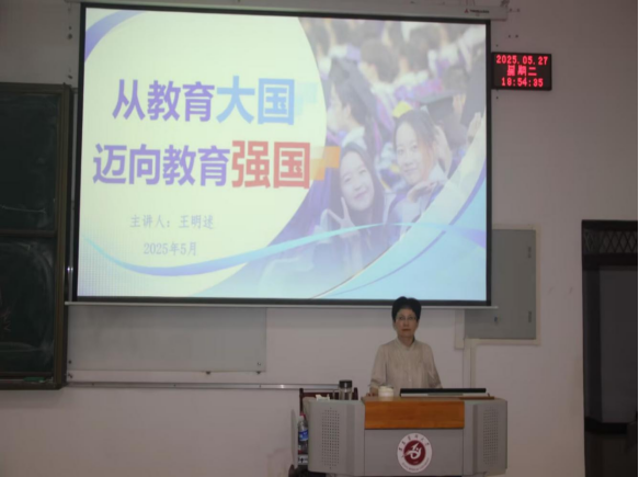 围绕“建设教育强国的战略意义”“我国教育发展的蓬勃态势与底气”“推进教育强国建设的改革路径”三个方面,王明述系统阐述了教育强国建设相关内容。在谈到教育对国家现代化建设的先导作用时,她强调教育是强国兴起的关键因素,能支撑和引领国家各项事业全面进步。她还深入讲解以“三大属性”为指引、围绕“六大特质”深化改革推进教育强国建设的举措。她指出,培育明确教育的政治、人民、战略属性,培养德智体美劳全面发展的社会主义建设者和接班人,培养有德有才的人才尤为重要,这是为避免无德人才带来的风险。此外,她叮嘱同学们要把握时代机遇,努力学习,为教育强国建设贡献力量。
