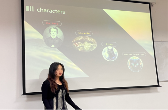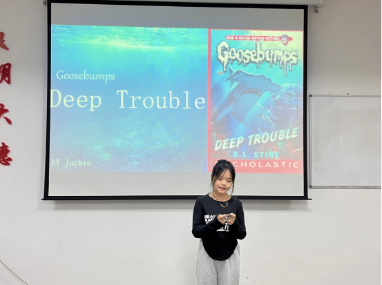 分享会开始,同学们陆续就位,热情澎湃。来自2021级的四名同学为我们介绍《黑猫》、《献给艾米丽的玫瑰》《大麻烦》两部小说。分享者讲解时完全沉浸其中,大家也听得津津有味,其间伴随着轻音乐的播放,现场氛围良好。讲解过程不仅有哲学性的话语,也有通俗易懂的小故事。分享者带大家走入一个个触动人心的故事之中,以精彩的表达方式给大家带来欢声笑语和轻松愉悦,让大家感受到勇敢无畏的人生和浪漫治愈的爱情。随后,分享会进入提问环节,观众对分享人提出了自己的问题,分享者就观众提问一一耐心回答,评委老师作出公正客观的评价。提问环节气氛活跃有趣,拉近了观众与选手的距离。同时,本次分享会展播了有趣的视频,激发了同学们读书的兴趣。
