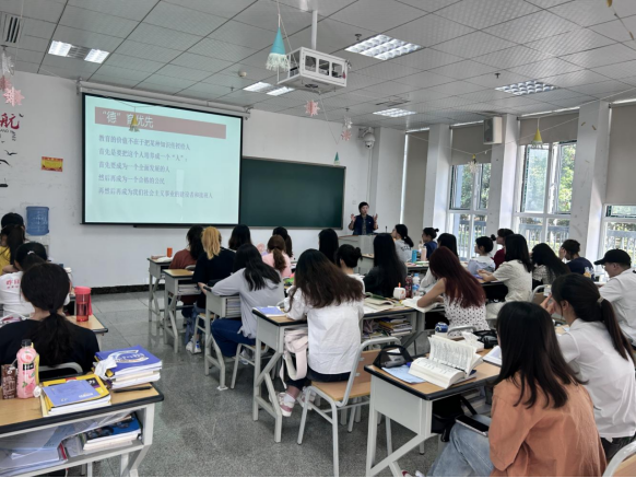 为深入贯彻落实习近平新时代中国特色社会主义思想,全面落实立德树人根本任务,努力引导学生扣好人生第一粒扣子。2023年4月19日,ok138cn太阳集团党委副书记唐茜在专业二教室为英语2021级2班开展了题为”德育为先”的思想政治教育课。