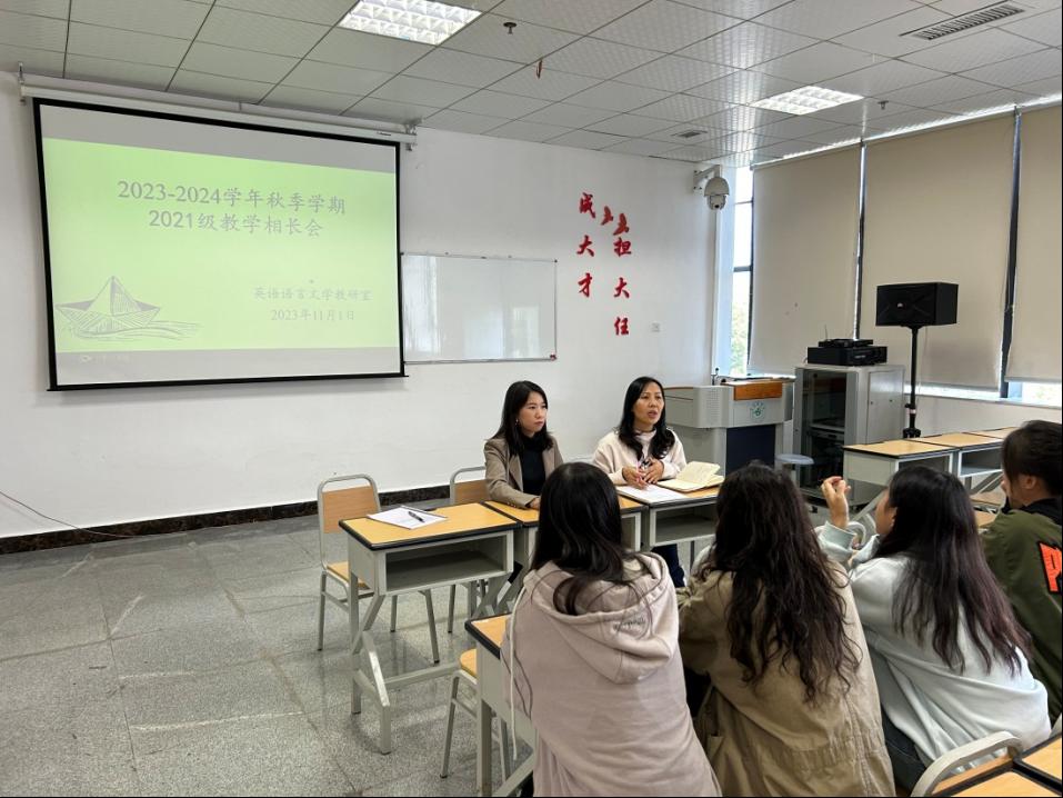 11月1日中午,英语语言文学教研室在专业五教室组织召开了2023-2024学年第1学期2021级英语专业教学相长会。英语语言文学教研室主任张序娅、英语语言文学教研室尹域、邹秀佶等教师、实习生王俊涛和2021级英语专业13名学生代表参加了本次会议,会议由张序娅主任主持。