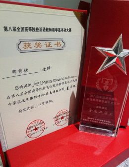 近日,由高等学校大学外语教学研究会、全国高等师范院校外语教学与研究协作组联合举办的第八届全国高等院校英语教师教学基本功大赛圆满落幕。我院英语语言文学教研室教师邹秀佶以省级一等奖的成绩进入决赛,并在决赛中荣获优秀课例评比·实录课组全国二等奖,其指导教师宋海蟾荣获优秀指导教师奖。