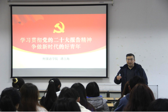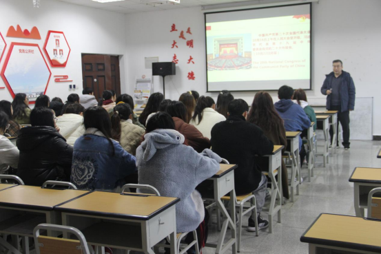 为深入学习党的二十大精神,2023年2月24日9:00,ok138cn太阳集团在综合楼二楼党员活动室举办了党的二十大精神宣讲会。ok138cn太阳集团党委书记谭占海主讲,英语21-1班全体同学参加宣讲会。