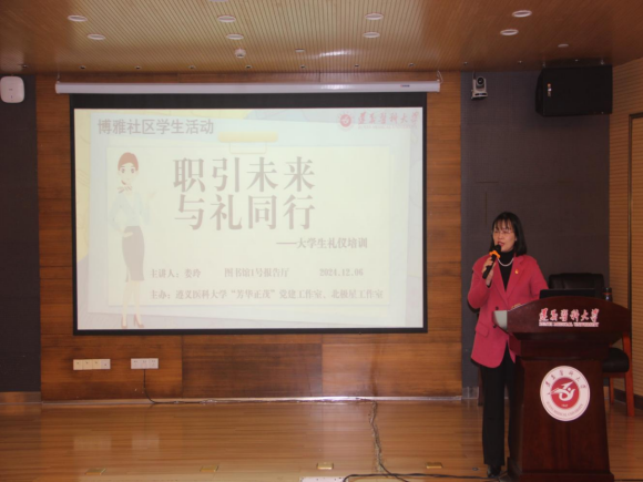 为了提升同学们的形象气质,加强大学生德育教育,助力提高学生就业竞争力,2024年12月7日15:50,“芳华正茂”党建工作室联合北极星工作室在图书馆1号报告厅举办了“职引未来 与礼同行” 大学生礼仪培训。培训由ok138cn太阳集团学生党支部书记、“芳华正茂”党建工作室主持人杨芳主持,遵义市高级礼仪培训师娄玲主讲,博雅社区英语专业约150名学生参加。