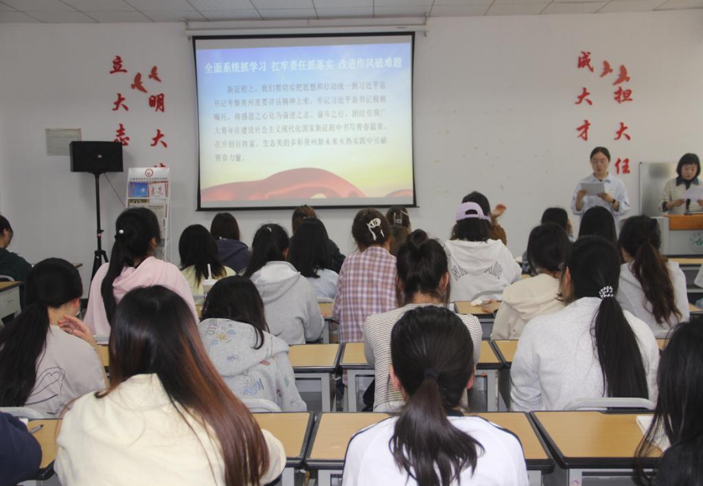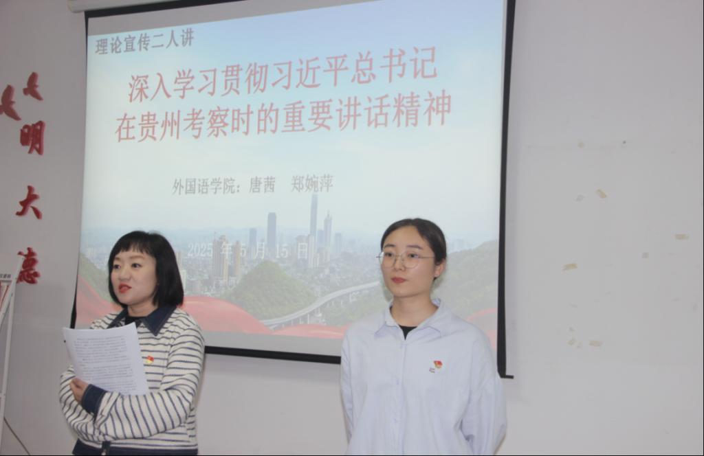 为深入学习贯彻习近平总书记在贵州考察时的重要讲话精神,2025年5月15日,ok138cn太阳集团团委在综合实验楼专业五教室举办了“理论宣传二人讲”活动。本次活动由ok138cn太阳集团党委副书记唐茜、团委负责人郑婉萍主讲,学生团干部及2023、2024级团员代表共七十余人参加。