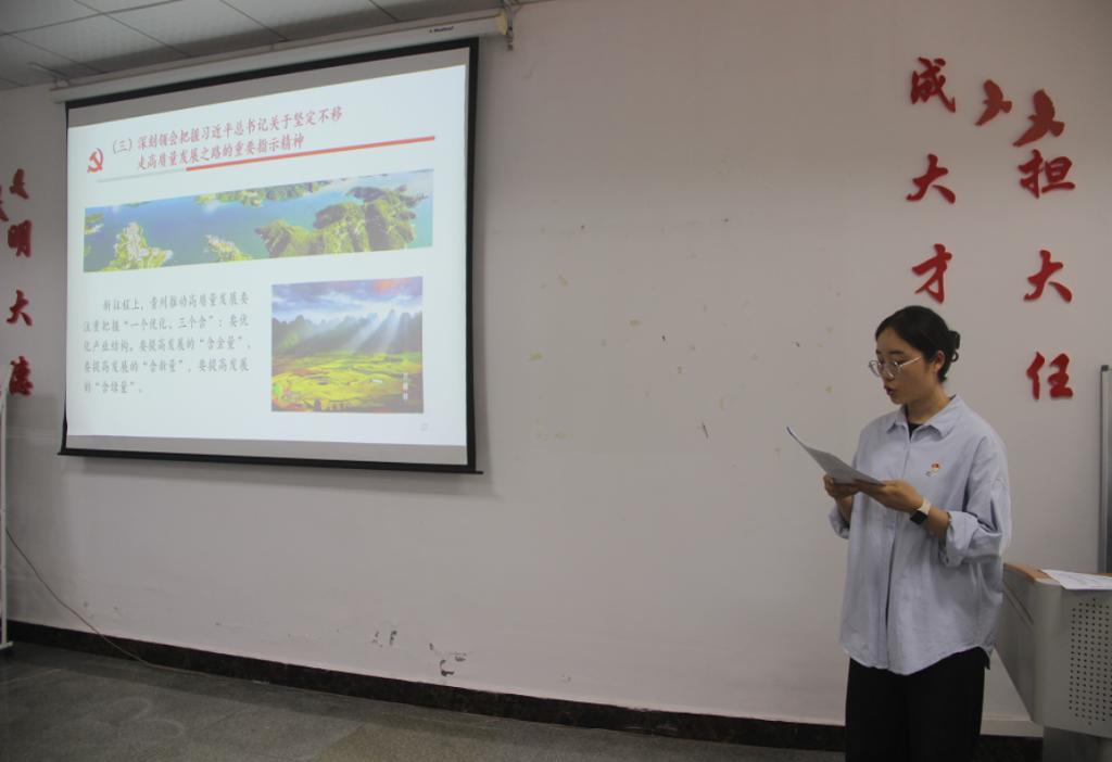 郑婉萍从习近平总书记在贵州考察重要讲话的背景和意义入手,详细阐述了讲话中的“两个特点”和“七个深刻领会把握”,深刻阐释了习近平总书记重要讲话的精神实质和丰富内涵。唐茜结合实践案例,从高质量发展、发展和生态、民生、党的建设等方面进行了系统的阐述和解读,并针对英语专业的学生未来发展和就业前景等进行了详细分析与指导。最后,唐茜带领全体同学一起学习了习近平总书记给谢依特小学戍边支教西部计划志愿者服务队队员回信,深刻领会习近平总书记对青年“听党话、跟党走”的嘱托,号召同学们“到祖国最需要的地方去”,为强国建设凝聚青春力量。