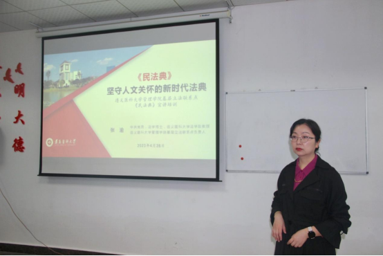 为深入学习贯彻习近平法治思想和习近平总书记关于加强民法典学习宣传的重要指示精神,让民法典走进校园,走进班级,促进大学生法治素养提升。2023年4月28日10:20,ok138cn太阳集团在专业五教室开展民法典知识讲座,讲座由法学博士、副教授张渝老师主讲,张渝老师是ok138太阳集团古天乐管理学院基层立法联系点负责人、遵义市第五届人大常委会立法咨询专家、遵义市委市政府法律咨询专家、贵州省百名法学专家学者资深律师宣讲团成员、遵义第三届仲裁委员会仲裁员、遵义市人民政府立法咨询专家。2021级B班和2022级B班全体同学参加了本次讲座。