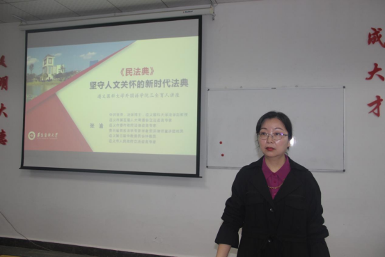 张渝老师以民法典一波三折的制定过程为切入点,围绕民法典的编撰历史、民法典的重大意义以及民法典的人文关怀三大内容进行宣讲。张渝老师以日常生活事件举例,生动形象地为大家讲述相关法律知识,并热心解答了同学们的疑惑,帮助同学们懂得了责任与担当,明白如何用正确方式行使自己的权利以及如何利用民法典维护自身合法权益。张渝强调,民法典涵盖各个群体,民事主体在民事活动中的法律地位一律平等,“弱者”,也是平等的人。