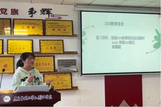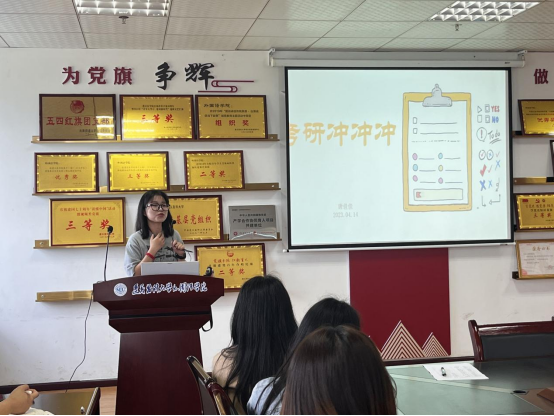 杨芳向大家介绍了学院今年的考研情况,并表示学院将对我院学子的备考给予全力全方位支持。她对备战考研的同学介绍了考研的重要性,提出了几点建议,并给予了厚望。四位同学畅谈了自己的考研经历,表达了对学院培养的感恩之情。他们围绕着报考院校和专业的确定、复习进度的安排、备考资料的选择、学习方法的运用、解压方法的技巧等方面进行了详细的阐述。她们还重点提醒大家,根据自己的实力理性报考院校,根据目标院校的出题风格有针对的复习,不能照搬别人的学习经验,要根据自己的实际情况合理定位。复试更要提前做好充足准备,重中之重是一定要全力以赴坚持到最后一刻。