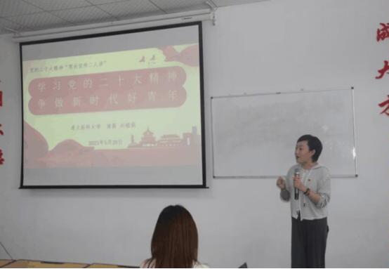 首先唐茜和刘福娟紧紧聚焦党的二十大主题主线,在综合楼二楼专业五教室给团支部干部们开展了学习贯彻党的二十大精神“理论宣传二人讲”宣讲会。