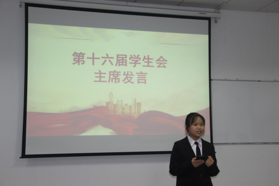 青春的接力棒在此延续,团体的领航人英勇前行。第十五届学生会主席李红红简述了学生会的常规工作,并诚挚表达对学生会这一团体的感谢与不舍。第十六届学生会主席项飘、第十六届团总支副书记陈世操发表未来的工作计划和就职感想,表示愿意全力与新一届学生会成员秉持为同学服务的宗旨,共同努力建设与发展学生会的工作。