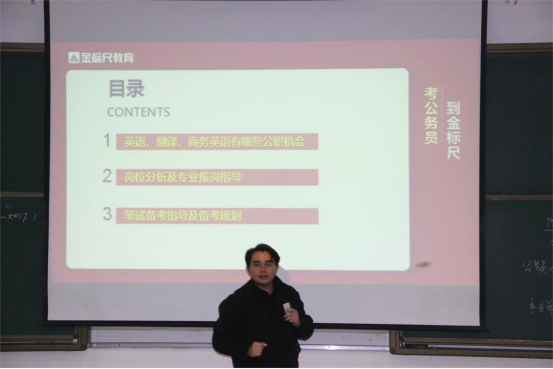 吴沈川针对我院学生的公职考试意向,围绕2024年国家公务员考试招录简章解读,选岗建议及报考指导,笔试面试阶段备考规划,银行、省考、事业单位、国企等招考简介及备考计划,贵州省定向选调生招考简介及备考计划五个方面进行详细地讲解。吴沈川深入分析了招录人数比,帮助同学了解目标岗位以及相应的岗位竞争情况,并耐心回答了同学们的提问,指导同学们有针对性地选岗。吴沈川还为在场同学提供丰富的线上公考网课资源。他提醒同学们要认真对待公职类考试,明确自己的目标,认真科学备考,找到合适自己的备考方法,提前做好考试准备。