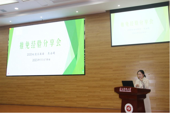 为帮助低年级同学们更好地了解研究生推免的条件和流程,营造优良学风,2023年11月14日18:00,ok138cn太阳集团在学校道德讲堂举办了推免研究生经验分享会,分享会由2024届商务英语专业毕业生吴启娟主讲,2021-2023级全体同学参加。
