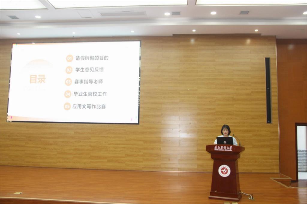 杨芳向同学们解释了请假销假的目的、各类赛事如何填报指导教师、毕业生离校工作、应用文写作比赛评选等。关于同学们对请假的反馈,她对学生提出的请销假疑问进行了解释和回应,并对同学们积极关注学院发展和勇于建言献策表示肯定。对于学生赛事填报指导教师的问题,针对专业赛事和思政文体赛事两类,她详细讲解了如何填报指导教师。对即将离校的毕业生,她详细讲解了离校各项手续及办理流程,并叮嘱了注意事项。同时,针对近期应用文写作比赛情况,她指出了参赛同学存在的共性问题,并对比赛的评选调整作了相关说明。
