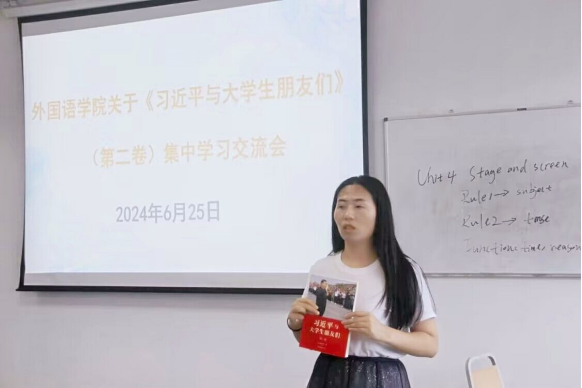 学习交流会分为两个环节:集体学习和分享交流。阮佳佳向同学们介绍了《习近平与大学生朋友们》(第二卷)一书的基本情况。全书共24个章节,以真人真事采访记录的形式,介绍了习近平与大学生朋友们的珍贵时光以及他对大学生朋友们的引领和启发。陈世操领学本书第一章的全部内容。1984年8月5日,时任正定县委书记的习近平邀请河北大学翟玉虎等约20名暑期返乡的正定籍大学生到县委会议室座谈,本章主要采访记录翟玉虎对当时座谈的情景的回忆。集体学习后,同学们踊跃分享。有的同学深受鼓舞,立志要扎根基层;有的同学感叹家乡旅游业的飞速发展;还有的同学认为无论在什么岗位,都能为祖国的发展和民族的复兴贡献应有之力......分享结束之后,阮佳佳对此次学习分享进行了总结,她鼓励同学们要扎根基层,到祖国需要的地方去发光发热、奉献青春。
