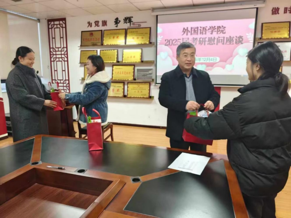 谭占海向全体考研学子表达了深切的关心与诚挚的问候。他的话语中充满了对同学们未来发展的期待和对他们当前努力的认可。在这一段充满鼓励的开场白之后,他激励同学们积极调整心态,面对考研这一人生的重要挑战。他强调,只有保持积极向上的心态,才能在复习备考中发挥出最佳水平。他建议学生们在努力学习的同时也要学会适时放松,可以多散步、听音乐或与朋友交流,这些都有助于缓解压力,保持良好的心理状态,同时应确保每天都有足够的睡眠和适量的体育锻炼。他还特别提醒学生们注意保暖防寒,尤其是在冬天,身体的健康是迎接考试的基石,同时,还要诚信考试,预祝大家取得好成绩。最后,老师们为考研学子送上了考研大礼包,包含了多种贴心物品,比如发热鞋垫、暖手宝、袜子等。这份考研大礼包不仅承载着学院的关怀,更寄托了全院师生对2025届考研学子美好的祝愿。它提醒着每一位考研学子,无论前路多么艰难,都有学院老师们的陪伴和支持。
