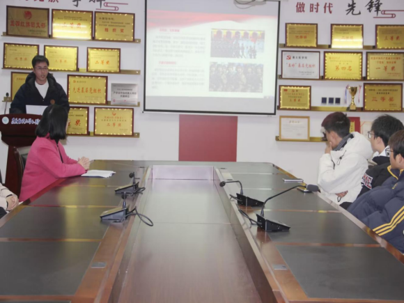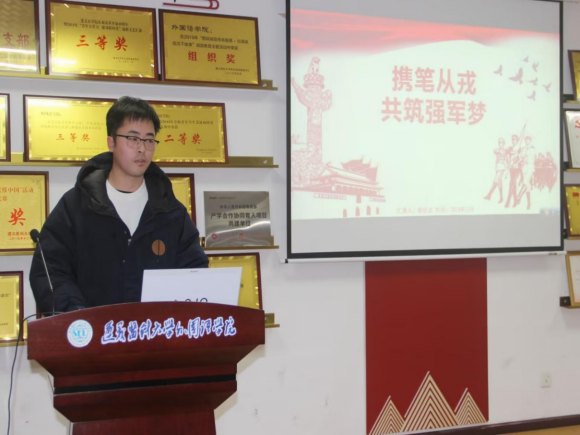 为积极响应党和国家号召,激发大学生踊跃参军入伍,2024年12月17日16:00,ok138cn太阳集团在综合楼414会议室举办了征兵入伍宣讲会。学院党委副书记唐茜、学生党支部书记杨芳、全院所有男同学参加,英语21-2班退役学生陈纪全主讲。
