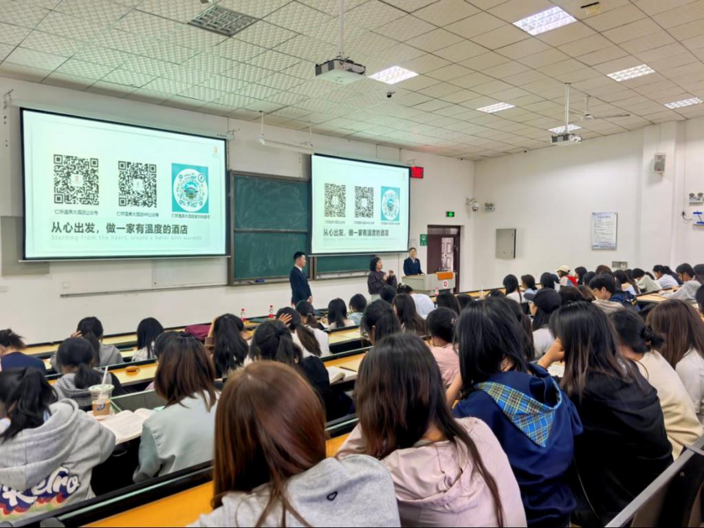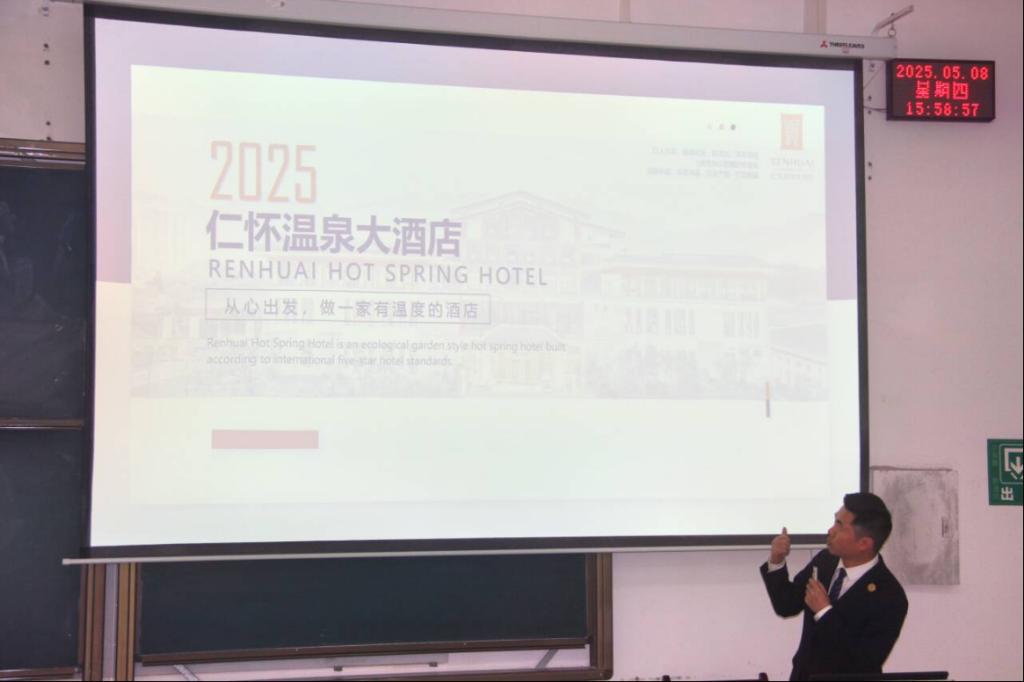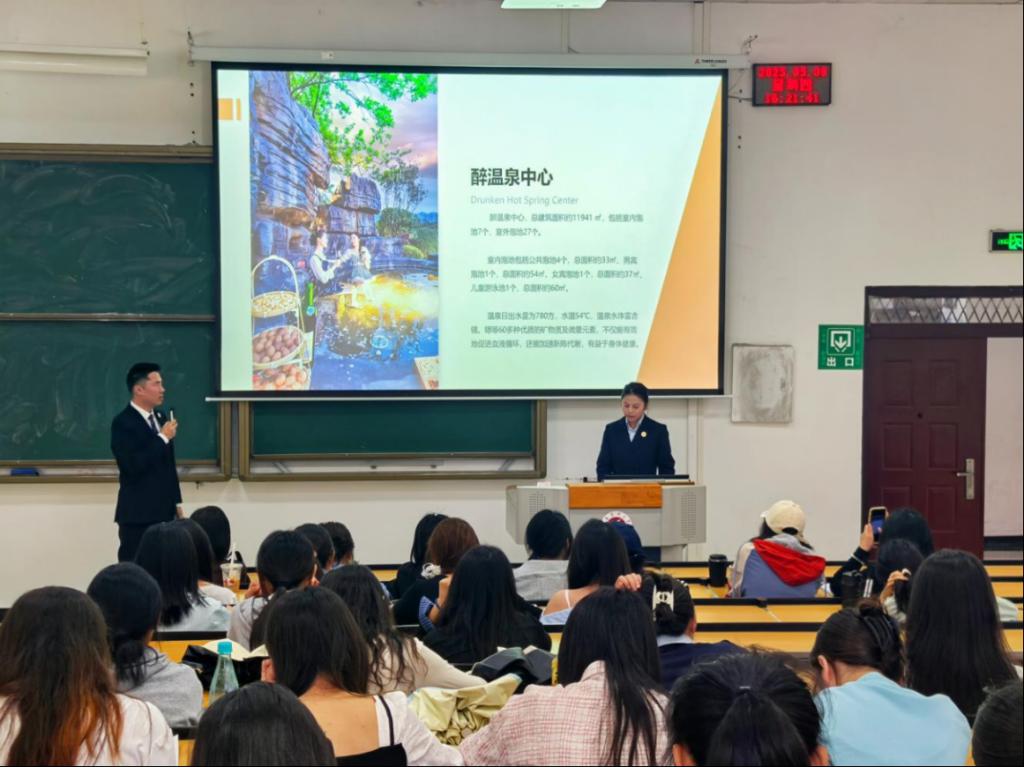 为深化校企合作,搭建学生实习与就业平台,高质量开展就业工作。2025年5月8日15: 50,ok138cn太阳集团邀请仁怀温泉大酒店相关负责人在第二教学楼第三阶梯教室开展招聘宣讲活动,本次活动由学院党委副书记唐茜主持,仁怀温泉大酒店办公室主任王晶晶、人事经理张悦悦主讲,酒店招聘主管张林、学院团委负责人郑婉萍、2021级和2022级共120余人参加。