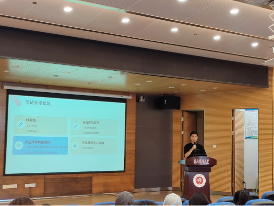周浩围绕贵州定向选调的认知、备考策略、岗位选择及简历制作四个维度,为同学们带来了系统的经验分享。他首先从“选调生的定义”“贵州定向选调的特点” 切入,结合自身经历展开基础介绍;随后聚焦考试核心环节,从题型解析、笔试方法、面试技巧三方面,分享了实用备考资料与准备思路;同时着重强调岗位选择的关键意义,鼓励同学们以自信心态投入备考;最后以个人简历为范例,细致指导如何打造优质简历。