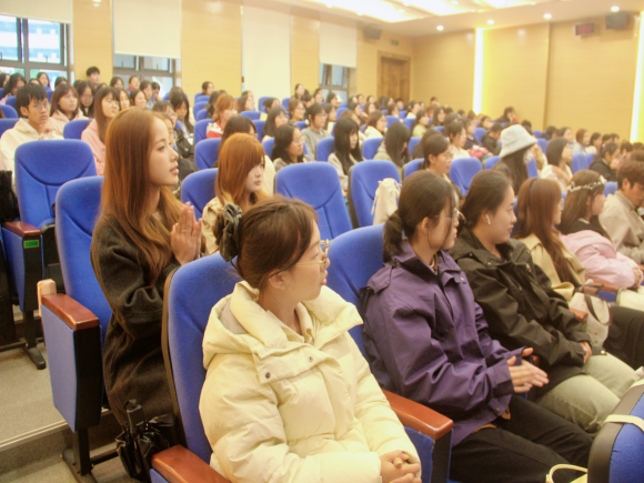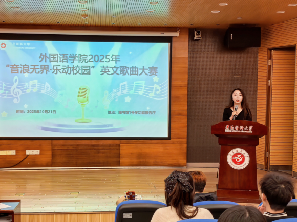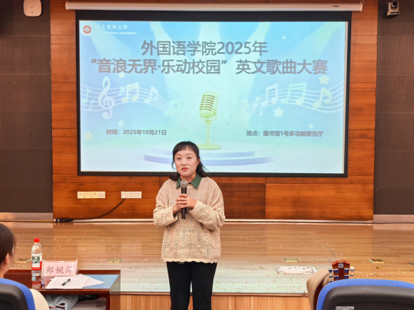 大赛自报名启动以来,得到了学院广大同学的积极响应,报名人数众多。院赛现场,选手们精神饱满、热情洋溢,带来了一首首风格各异的英文歌曲。有的选手以深情的演唱诠释经典歌曲,让观众沉浸在浪漫的氛围中;有的选手则选择充满活力的流行歌曲,用动感的节奏和富有感染力的表演点燃现场气氛。李菲、秦雪飞两位评委从歌曲演唱技巧、英文发音、舞台表现力等多个维度对选手进行专业点评。唐茜代表学院党委,向在比赛中脱颖而出的获奖选手表示热烈祝贺,也向所有勇敢站上舞台的参赛者、评委、精心筹备赛事的工作人员,以及到场支持的师生们,致以衷心的感谢;希望同学们以本次大赛为起点,继续保持对语言学习的热爱,把在歌声中感受到的文化力量,转化为深耕专业、提升素养的动力;也期待未来有更多同学站上学院搭建的各类平台,用外语讲好中国故事,用热爱点亮青春舞台。本次比赛最终评选出一等奖2名、二等奖3名、三等奖4名、优秀奖11名。其中一等奖选手将代表ok138cn太阳集团参加校级“音浪无界・悦动校园”英文歌曲大赛。