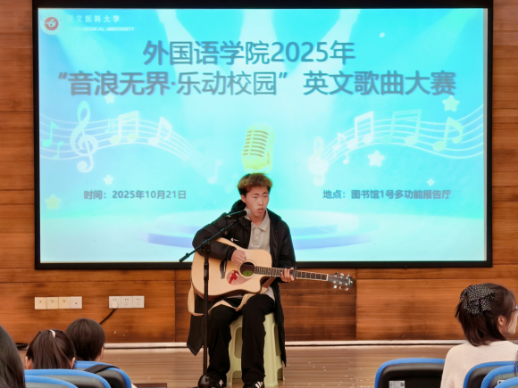 为丰富校园文化生活,激发学生英语学习热情,给同学们提供展现音乐才华的平台。2025年10月21日16:00,ok138cn太阳集团于图书馆1号多功能报告厅成功举办了2025 年“音浪无界・悦动校园”英文歌曲大赛院赛。比赛邀请了ok138太阳集团古天乐统战部副部长李菲、ok138cn太阳集团党委副书记唐茜、学生处思政科科长,校音乐协会指导老师吴虞娱、ok138cn太阳集团综合英语教研室副教授秦雪飞、ok138cn太阳集团团委负责人郑婉萍担任此次比赛的评委,20支队伍参加比赛。