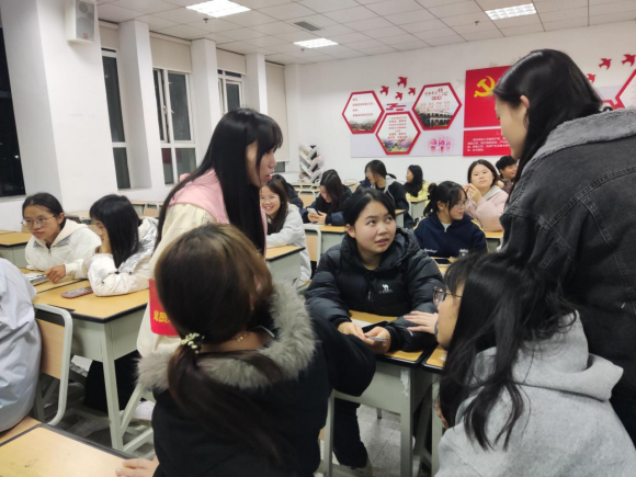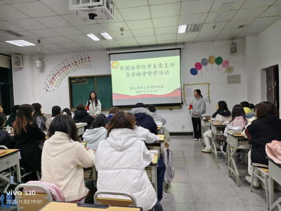 2025年11月3日19:00,学院在综合实验楼专业七、专业九教室开展导学助学督学活动。英语专业2024级校级“三好学生”“优秀学生干部”、入党积极分子罗定钊、袁紫诺、张玉洁、刘广艳四位同学,以“先锋榜样”身份深入2025级新生班级分享。她们既从考试逻辑切入,详解高效备考、重点抓取、学娱平衡的实用方法,指导新生提前规划复习、重视平时积累;更以入党积极分子的责任担当,强调“诚信考试、杜绝作弊”的纪律要求,传递“踏实治学、严于律己”的价值理念。互动环节中,四位同学耐心解答新生疑问,现场氛围热烈,让新生在获取方法的同时,更树立了正确的学习观与规矩意识。