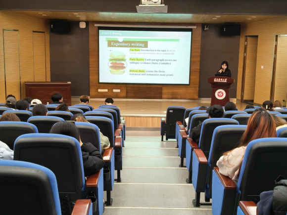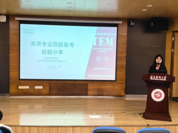 在英语专四备考经验分享中,英语23-3班石娣同学围绕考试题型拆解备考策略:听力侧重“真题精听”提升理解能力,阅读强调“词汇积累+技巧运用”兼顾速度与准确率,写作翻译注重“素材储备+实战练习+批改优化”。她在分享中还融入“外语学习服务国家对外交流需求”的意识引导,帮助同学们明确专业学习的意义,让备考不仅是能力提升,更成为锚定“专业报国”方向的过程。
