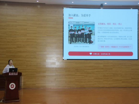 郑婉萍围绕无偿献血的意义、献血条件、流程规范、注意事项及相关政策法规等内容展开讲解。结合献血救助案例,用生动易懂、贴近青年的语言,深入阐释了无偿献血的重大意义:血液是不可替代的生命资源,每一袋热血都关系着重症患者的生死安危,关系着无数家庭的希望与未来。并对献血条件及存在的献血误区进行详细讲解,澄清常见认知误区,引导同学们正确、科学地看待无偿献血。唐茜则结合自身献血经历,鼓励青年学生积极参与到献血行业中来,希望每一位符合条件的青年大学生,用热血铸就希望,用爱心点亮生命。